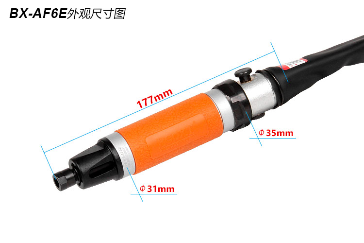 • 產(chǎn)品參數(shù): 夾頭直徑:5mm 往復(fù)行程:6mm 行程轉(zhuǎn)數(shù):7500bpm 總 長:177mm 耗 氣 量:0.25m3/min 重 量:0.58kg;使用工作壓力:0.65Mpa;推薦氣管尺寸:8mm